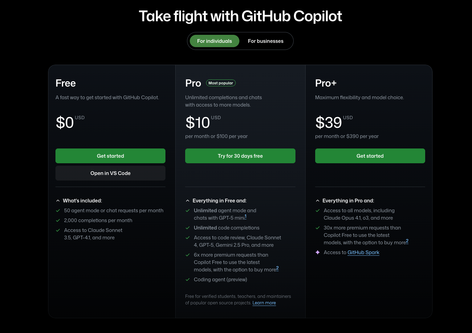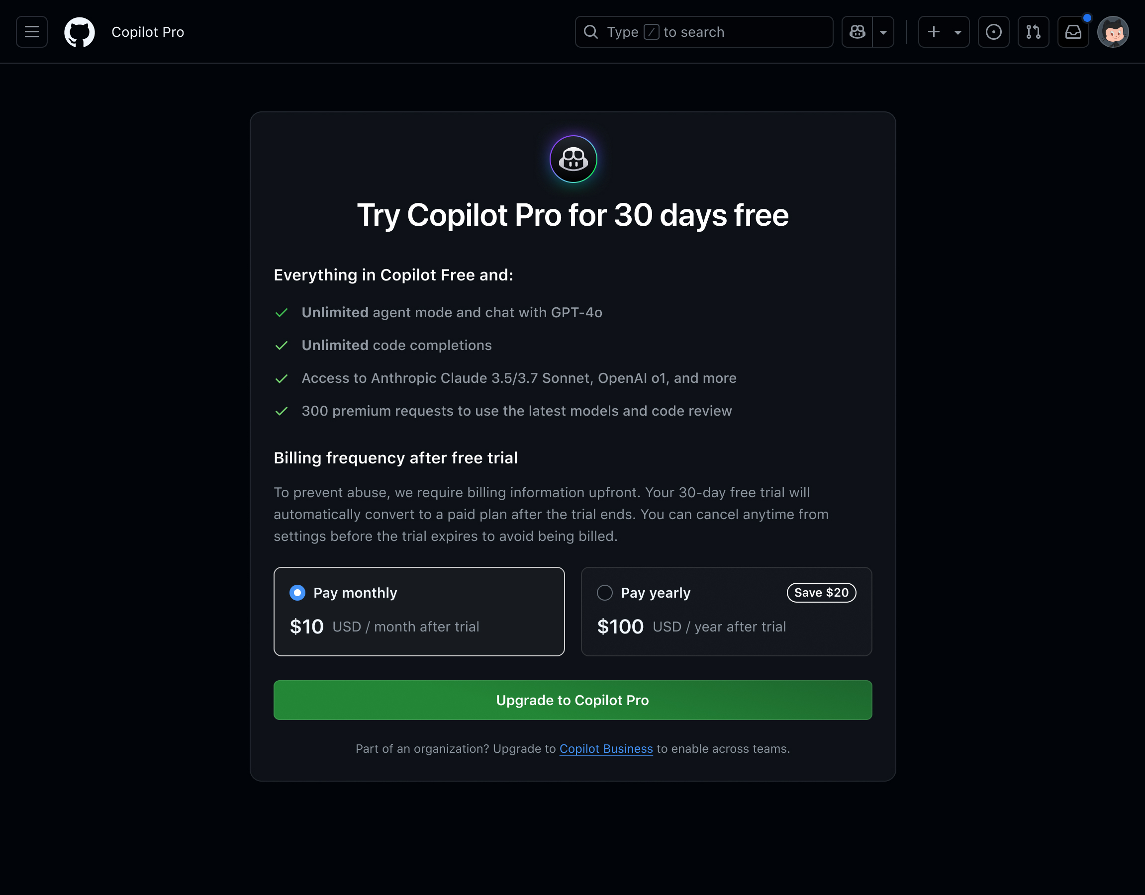 GitHub Copilot was rapidly evolving, but our customer journey was fragmented. Marketing pages, and billing flows weren’t aligned while upgrade paths were virtually non-existent. This created friction and confusion. I led design across key touch points to create a cohesive, adoption-driven flow during one of our biggest launches in history. Together, these changes stitched the funnel into a clearer, more compelling journey, helping developers go from awareness to trial to paid adoption with less friction.