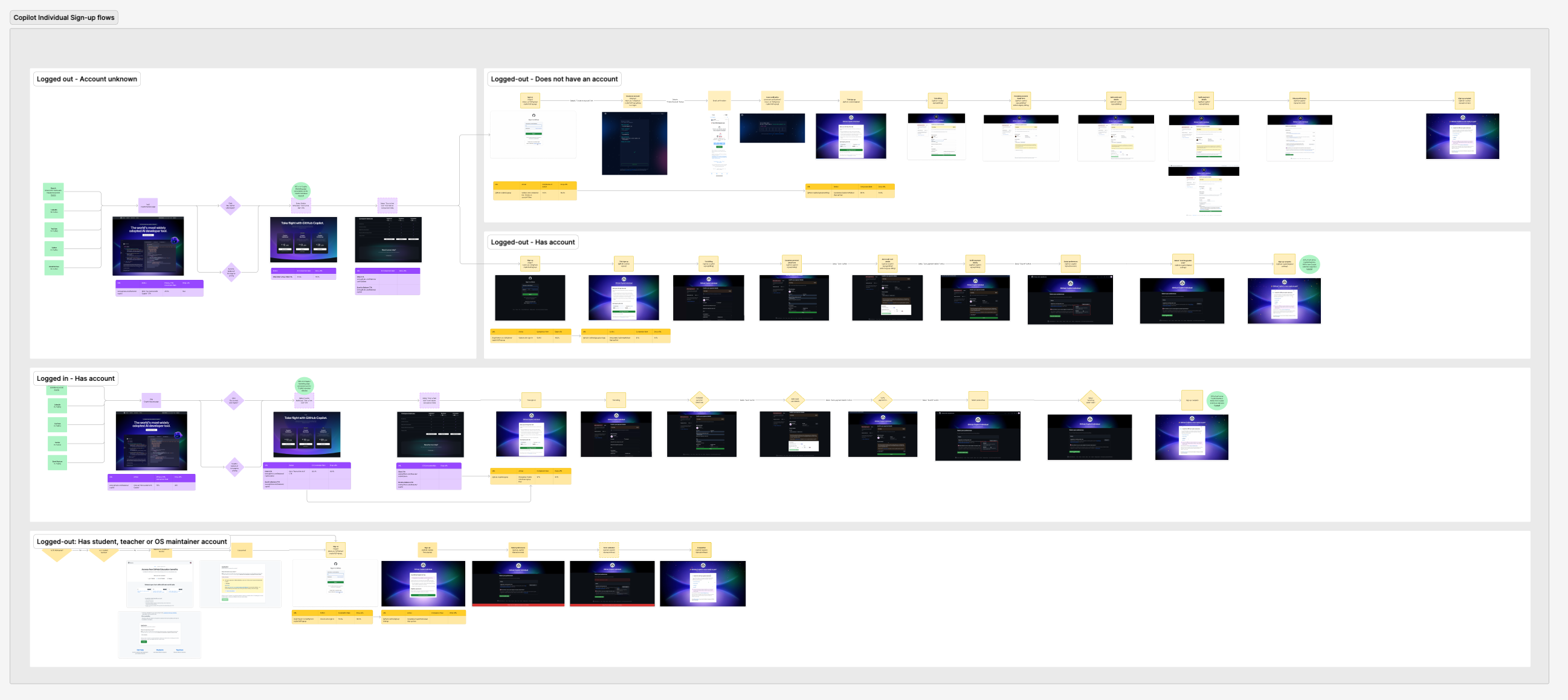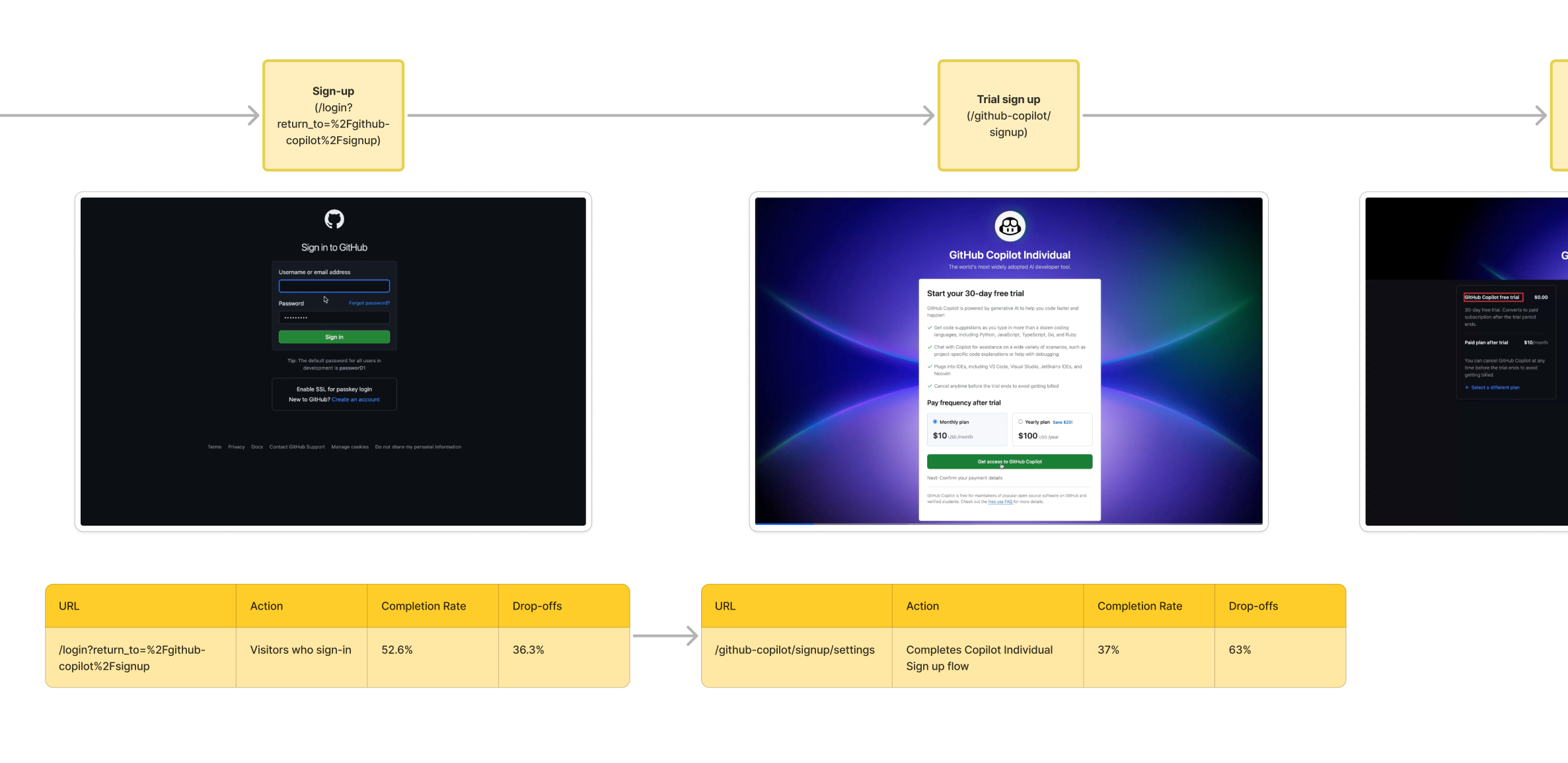 Copilot's billing and upgrade flows were long and inconsistent across SKUs, leading to friction and high drop-off rates.Previously, users couldn’t see pricing details until after they logged-in. Not surprisingly, we saw a lot of drop-off prior to that. Low completion rates led us to investigate and discover users were being thrown between multiple “chained” sign-up flows and authentication experiences, facing broken UX loops and functional bugs within the check-out experience.