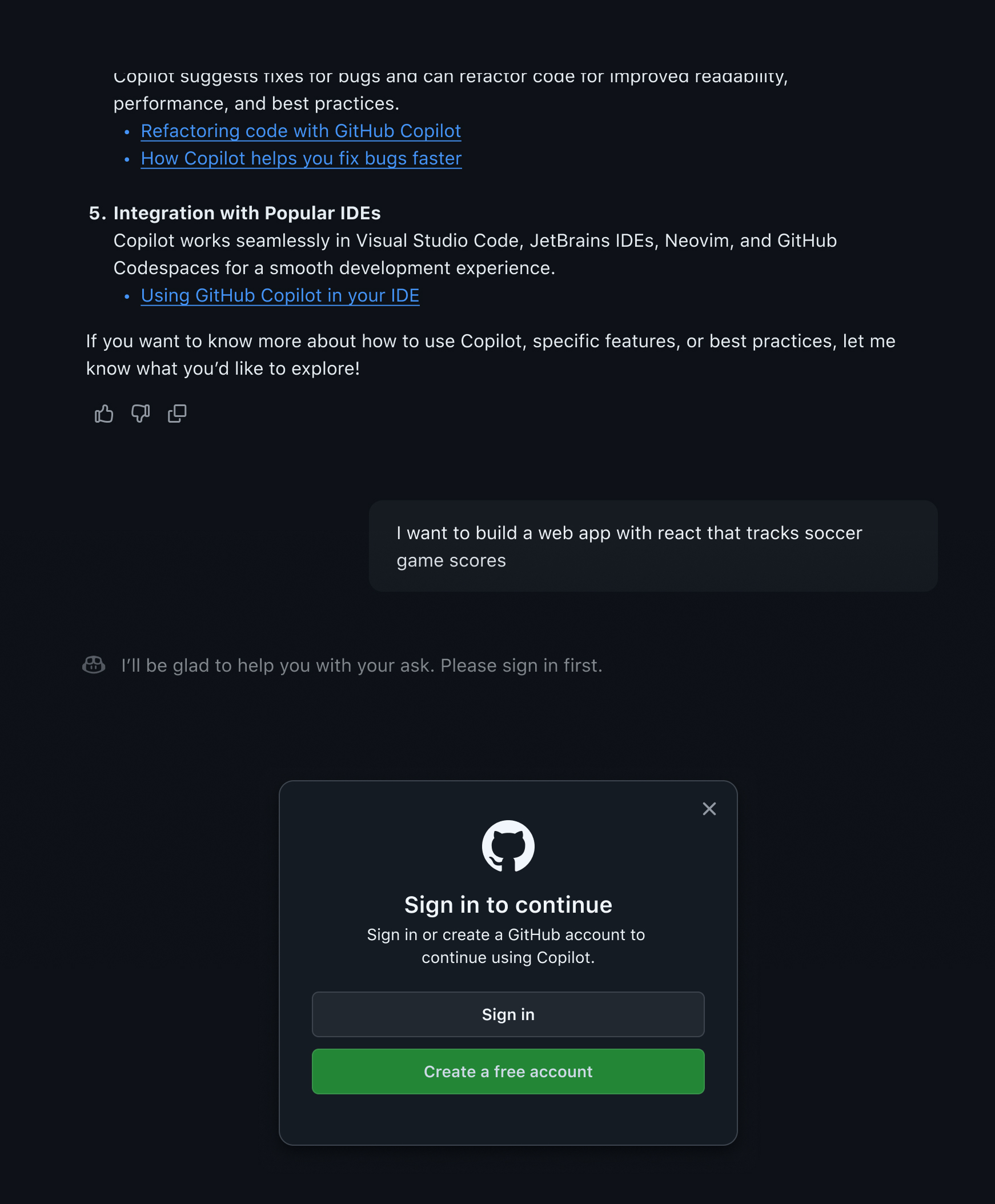 AfterUsing predictive searches, IDE onramps, and pre-canned responses, we gave logged-out users a taste of engagement to help incentivize sign-up.