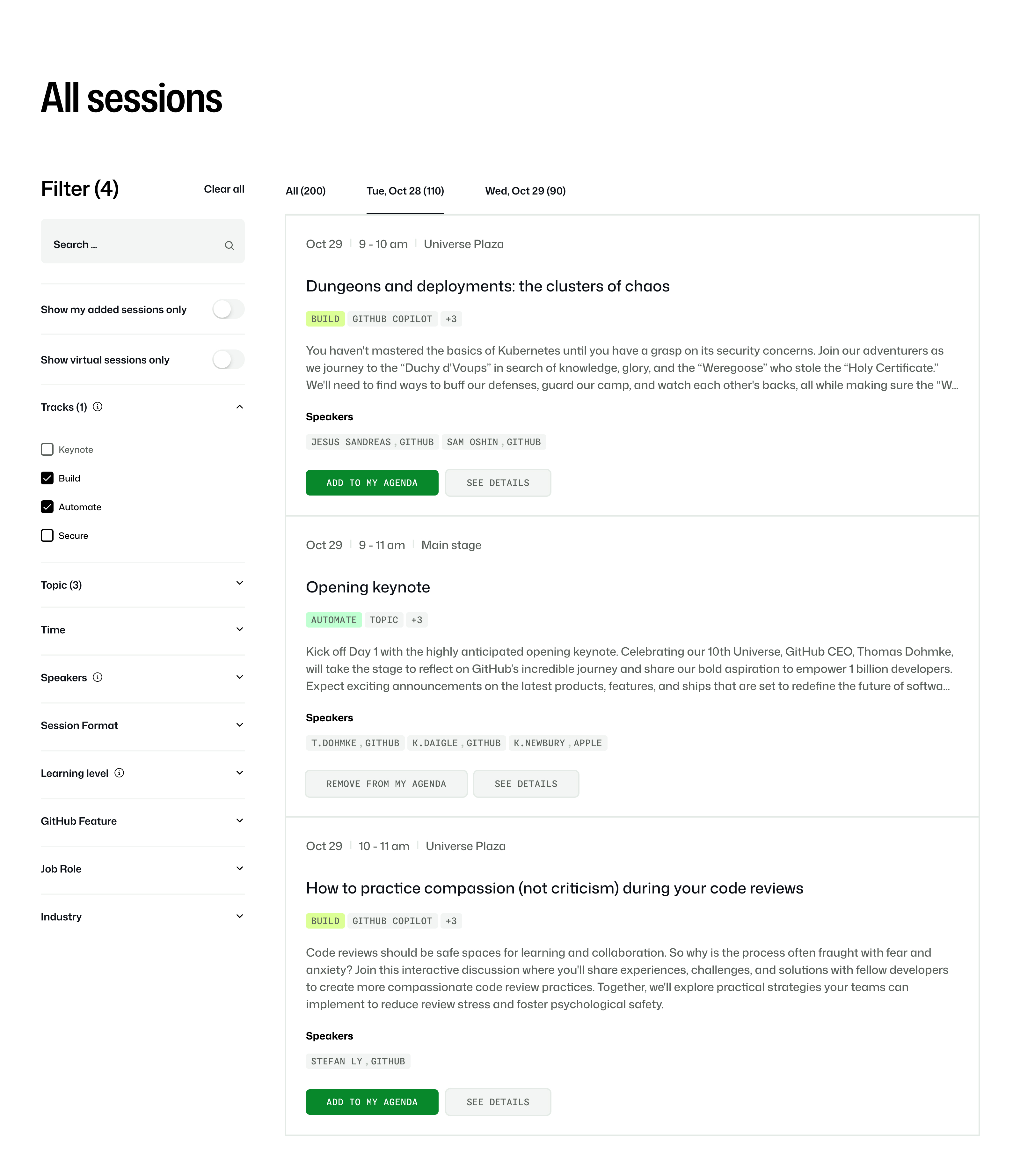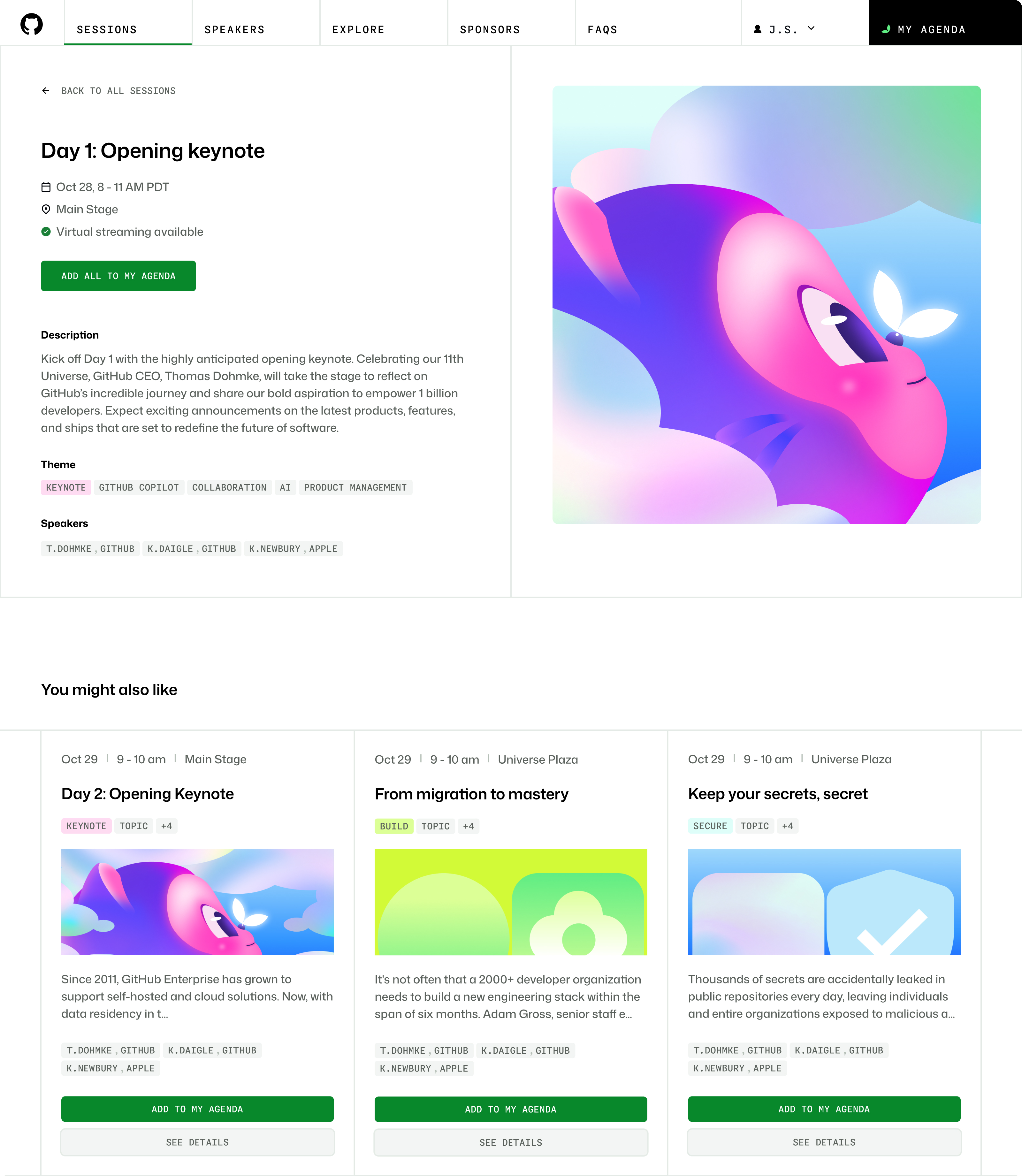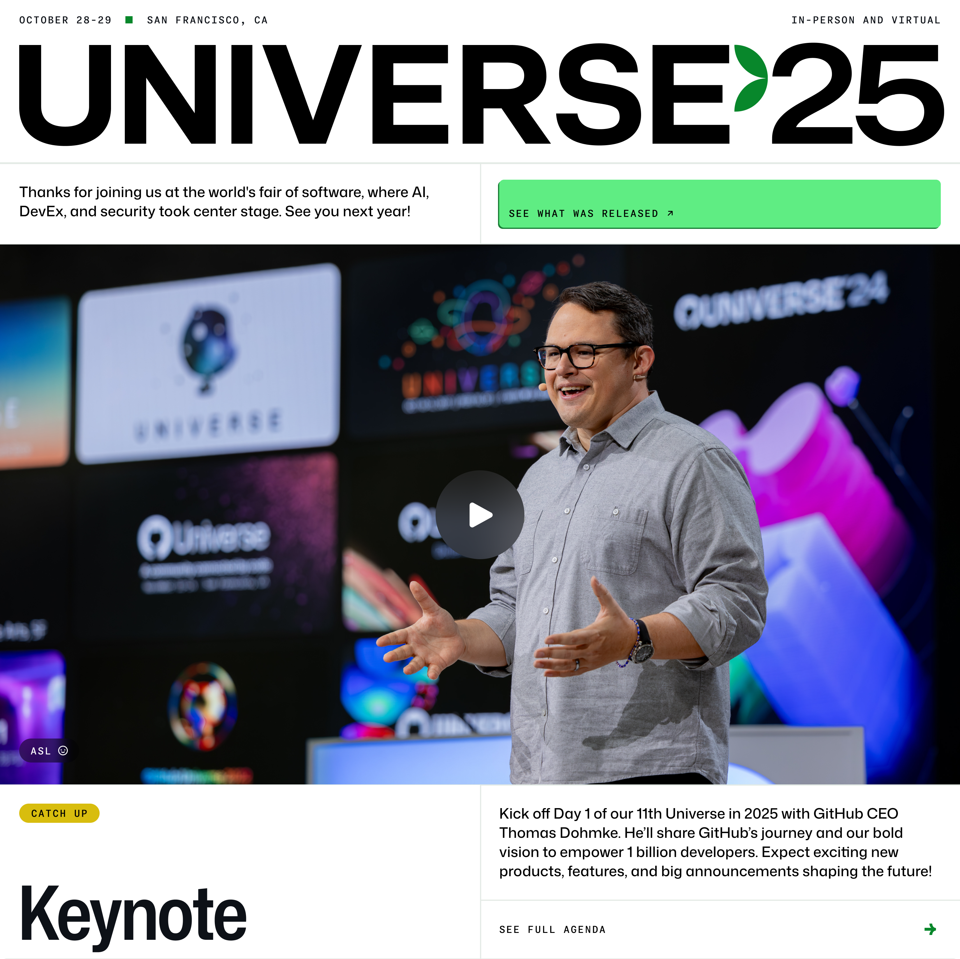 For many attendees, GitHub Universe is their first real encounter with our brand, and the moment that shapes how they talk about us long after. It’s our biggest stage to show what we’re building, bring our community together, and turn curiosity into connection. Universe should be a catalyst. So we reimagined an event experience that helps you plan your day, anticipates your needs during and after the event, and feels more like a concierge than a control panel. We sought out to create a world-class experience that left people impressed, excited, and ready to come back.